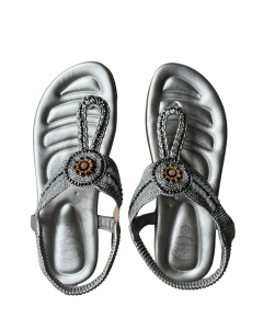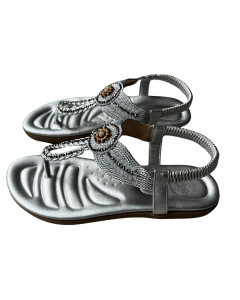 - Kleur: zilveren sandaal met teenstuk, uitgewerkte wreefband met steentjes.