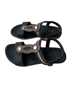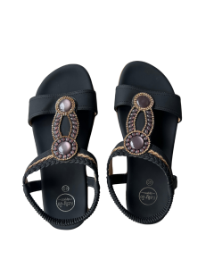 - Kleur: zwarte sandaal met gevlochten bandjes, subtiele bruine stenen en strassdetails